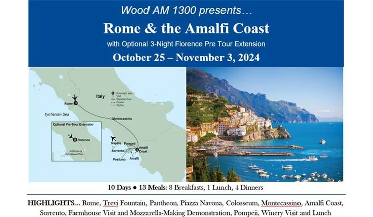 We’ll spend 3 nights in Rome and 5 nights on the Amazing Amalfi Coast! We’ll see Classical Rome with an visit to the Legendary Colosseum, Discover the ruins of Pompeii….Enjoy the Seaside town of Sorrento and visit a family-run farm to learn how they make Mozzarella Cheese! Experience breathtaking views throughout our stay on the Amalfi Coast, and even Sip wine with a Neapolitan lunch at the foot of Mt Vesuvius! This & so much more!