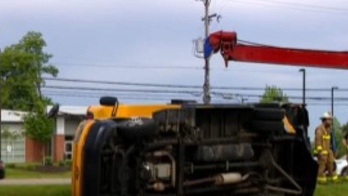 A screengrab image from WOOD-TV 8 at the scene of a crash between a Thornapple-Kellogg school bus and a car on the East Beltline at Bradford Street on Wednesday morning, May 28, 2025.Photo: Source: WOOD-TV 8.